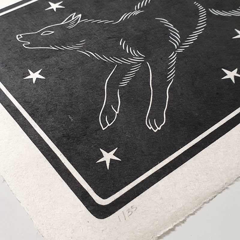 A lone wolf runs across a starry black night sky, howling at the cosmos in a celestial scene. The print is inspired by the Latin phrase per ardua ad astra (“through adversity to the stars”) and bears resemblance to the Canis Major constellation. This monochromatic print is crafted on off-white, sustainably sourced handmade paper.