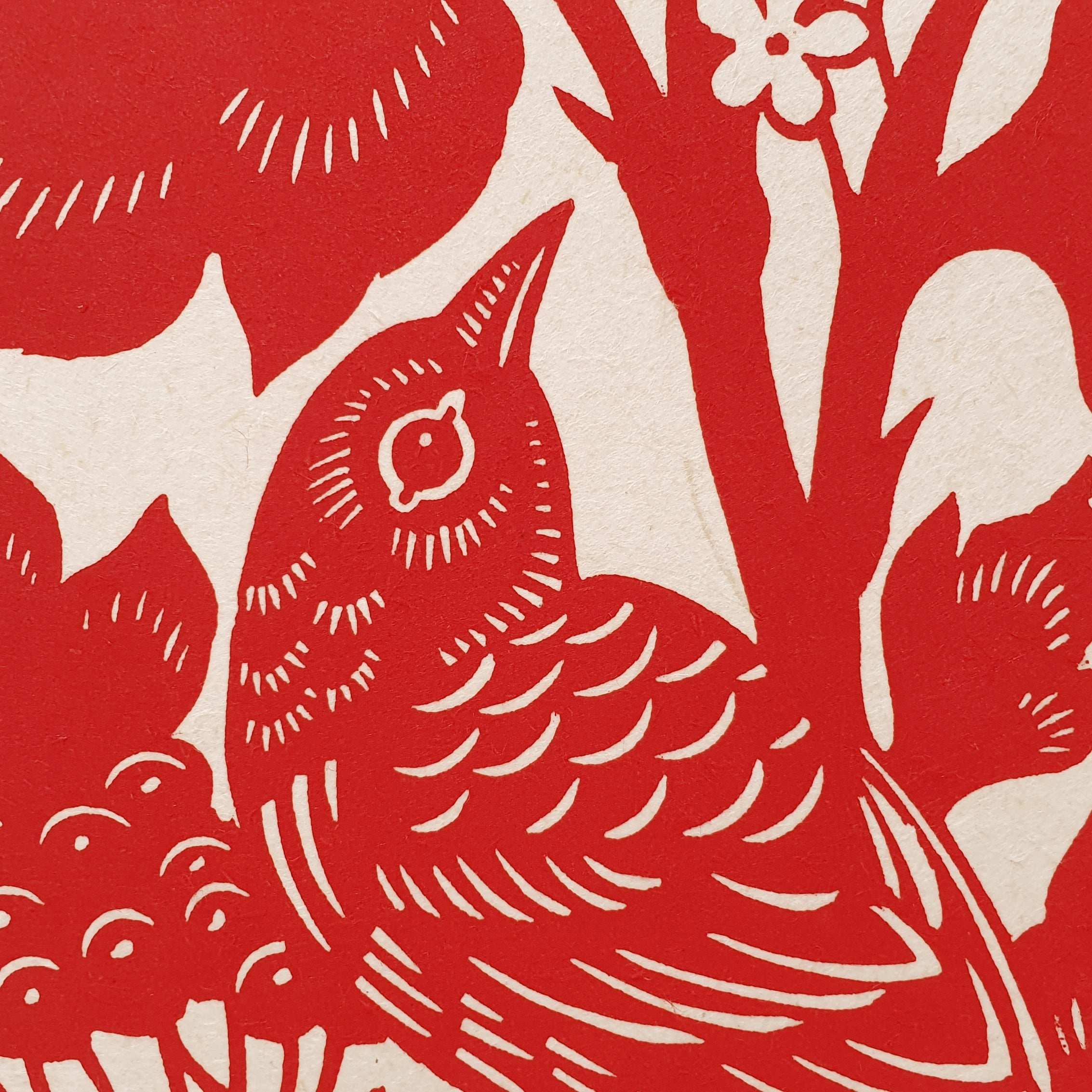 Two nightingales perch in a flowering guelder berry (kalyna) shrub in this vibrant design inspired by Ukrainian folklore. Printed on sustainably sourced white handmade paper with a natural deckle edge.
