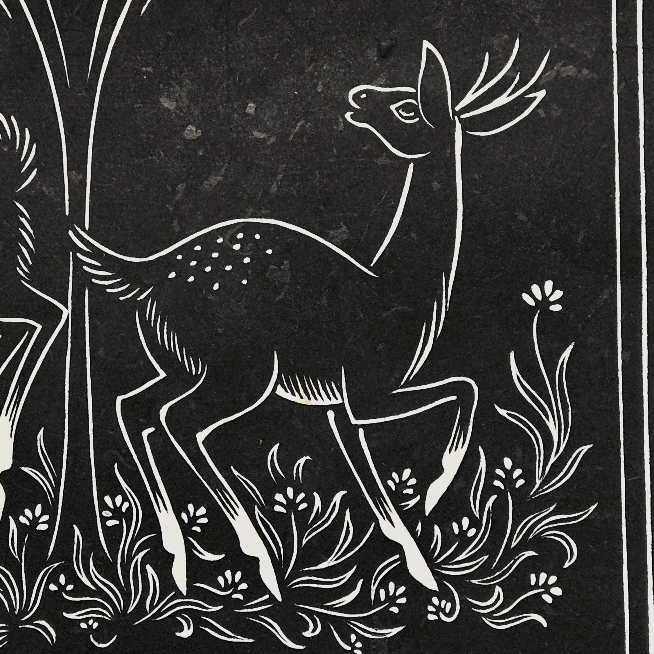 Two deer leap joyfully beneath a tree in the black of night, while a pair of birds perch quietly above. The scene blends playfulness with a hint of mystery, drawing on folk art traditions and woodland storytelling. Printed by hand on light beige, textured handmade paper that enhances the rustic feel of the design. Each print is carved and pressed by hand using traditional linocut methods, making every piece unique.