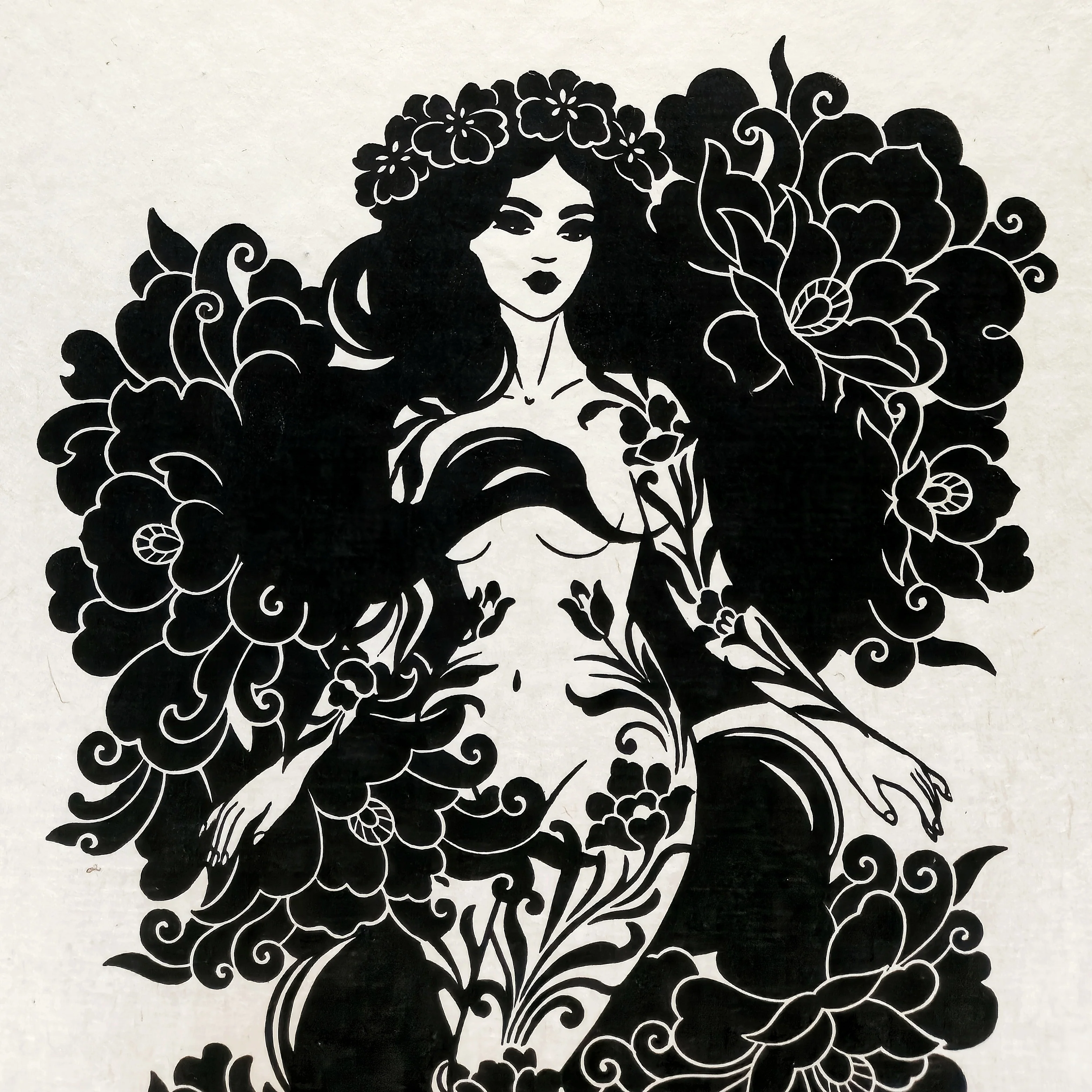 Celebrating the return of spring, "Persephone" is a handmade linocut print inspired by the Greek goddess of spring and queen of the underworld. Her return is marked by flowers, symbolizing her place between life and death. Printed by hand in black ink on unbleached, softly textured handmade paper with torn edges.