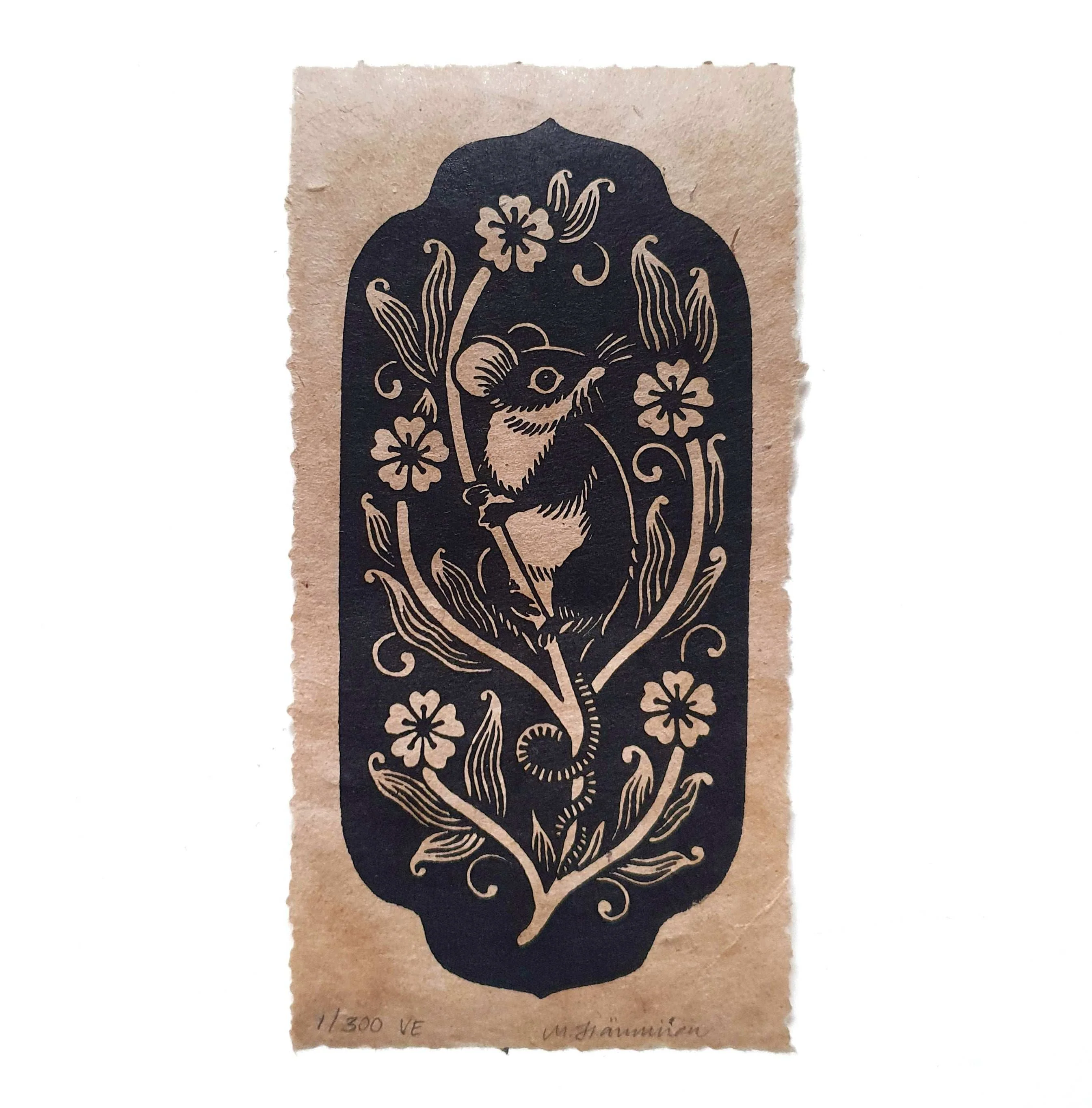 This print set features three small animals - a white rabbit, a field mouse, and a squirrel -surrounded by flowers against a black background with a decorative border. Inspired by Nordic folk art and friendship, the animals seem to share a moment of camaraderie amidst the blooms. This folksy design is printed on unbleached, sustainably sourced handmade paper.